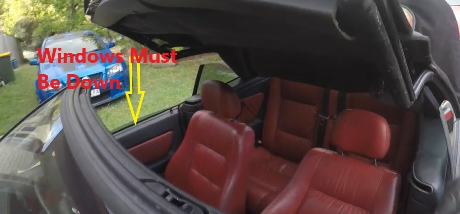 7. When the front of the roof reaches 1/2 way between the front a back of the car stop and hold and with the other arm reaches back and raise the rear-facing window (back windscreen) up and over the rear seat roll bars.