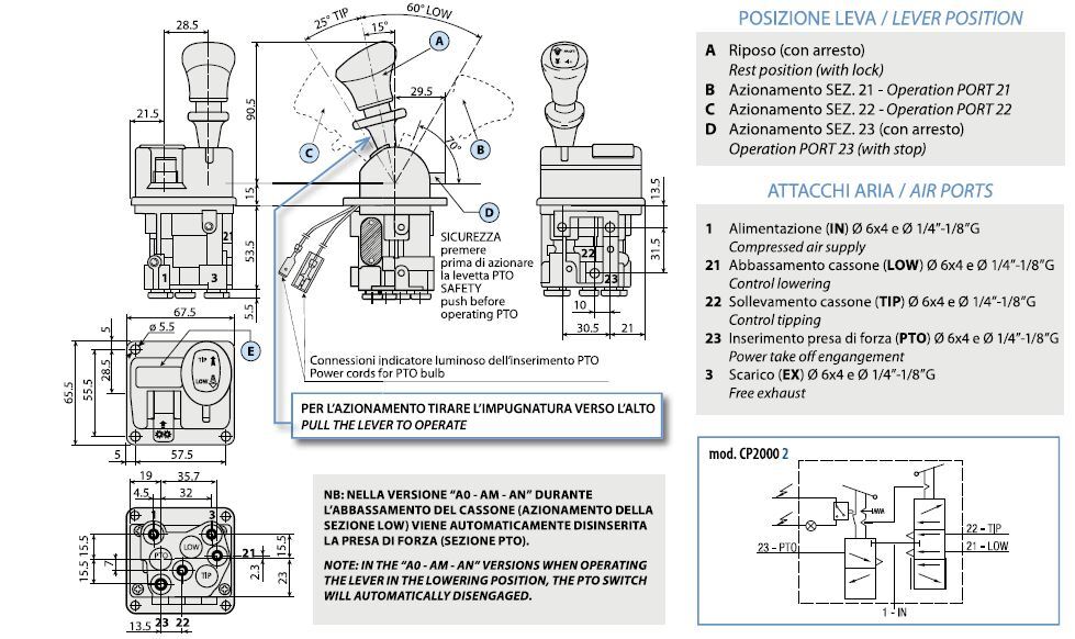 This is a Compressed Air control Valve and PTO Indicator switch in one unit, it will allow you to control from your driver's seat the Operation and engagement of Pneumatic PTO (Power Take Of) Gearboxes (for Running the Hydraulic pump) as well as controlling the Pneumatic actuated Tipper Valve for Raising and Lowering Tipper Hoist.