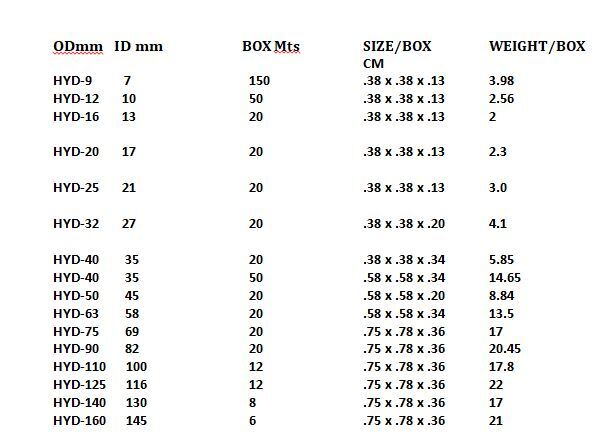 | OD mm | ID mm | Length (meters) | Size/Box (CM) | Weight/Box (Kg) |