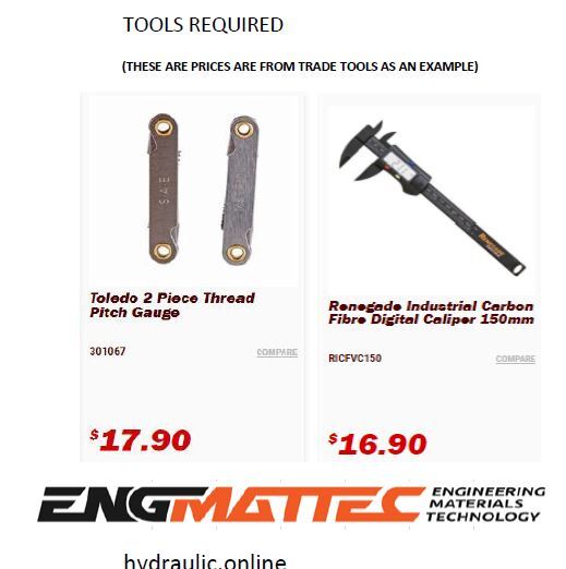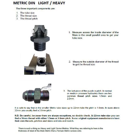 The threads below are the most common in Australia. However, there are a lot more uncommon types that do crop up. Attached in 'download files' (you must click buy first, free, & then you can download) are three excellent thread charts. The Hydraulic.Online thread chart which is perfect for identifying any thread type used in Hydraulics. The Ryco one is excellent in that it covers almost all available thread types. If you own a Komatsu machine, check JIS Metric, if you have Chinese made tractors etc, be very careful. As well as visually checking, you must carefully measure. They use BSP Flat Face, JIS BSP, & Metrics. Forklifts & car hoists are also worth taking time to double-check.